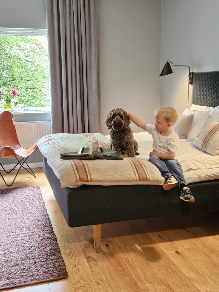 Om du har med dig en eller två hundar så betalar du 250:- extra per vistelse. Vattenskål och en filt till hunden finns på rummet att använda under er vistelse hos oss. Hunden får också en liten påse med godis.